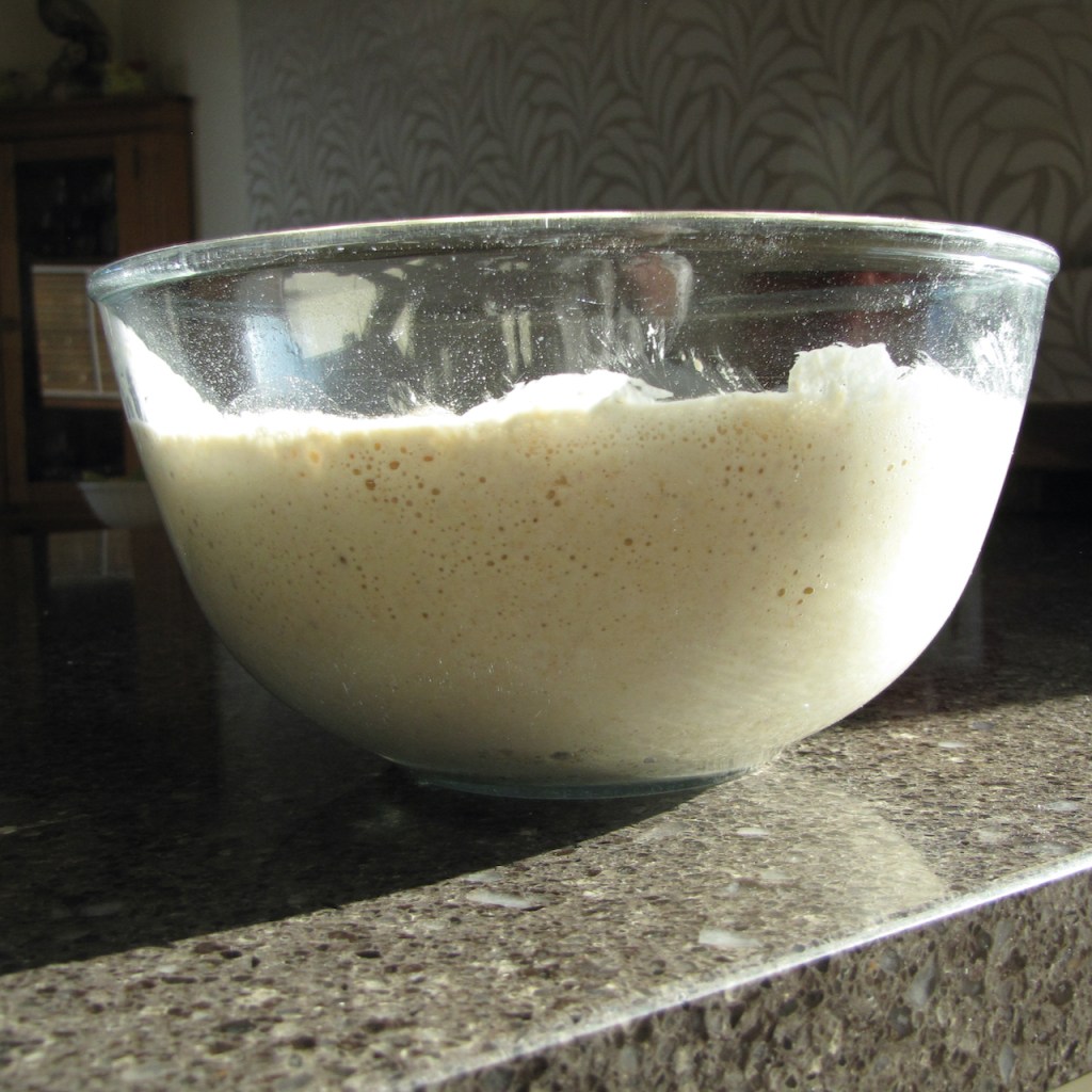 Monday 6 a.m. I pad barefoot into the kitchen rubbing my bleary eyes and take a look at my levain. It has turned from a gloopy, lumpy, thick gruel (appetising??) to a frothy batter. Exactly what we want. Right now, though, a strong cup of tea is more urgent … Then maybe some banjo practice before going back to bed for snuggles …