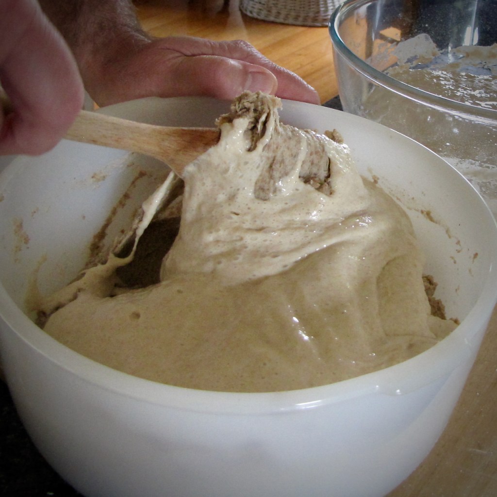 I now make the new starter: half a cup each of white and wholemeal flour, and enough water to mix to a stiff paste. I stir in about three dessert spoonfuls of the levain, cover this new starter and set it aside to get going. When it’s starting to bubble all over, it can go into the fridge until next baking day.