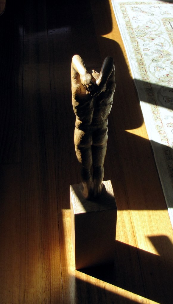 I discuss the pros and cons of sculpting in clay and wood, again with examples of my work.