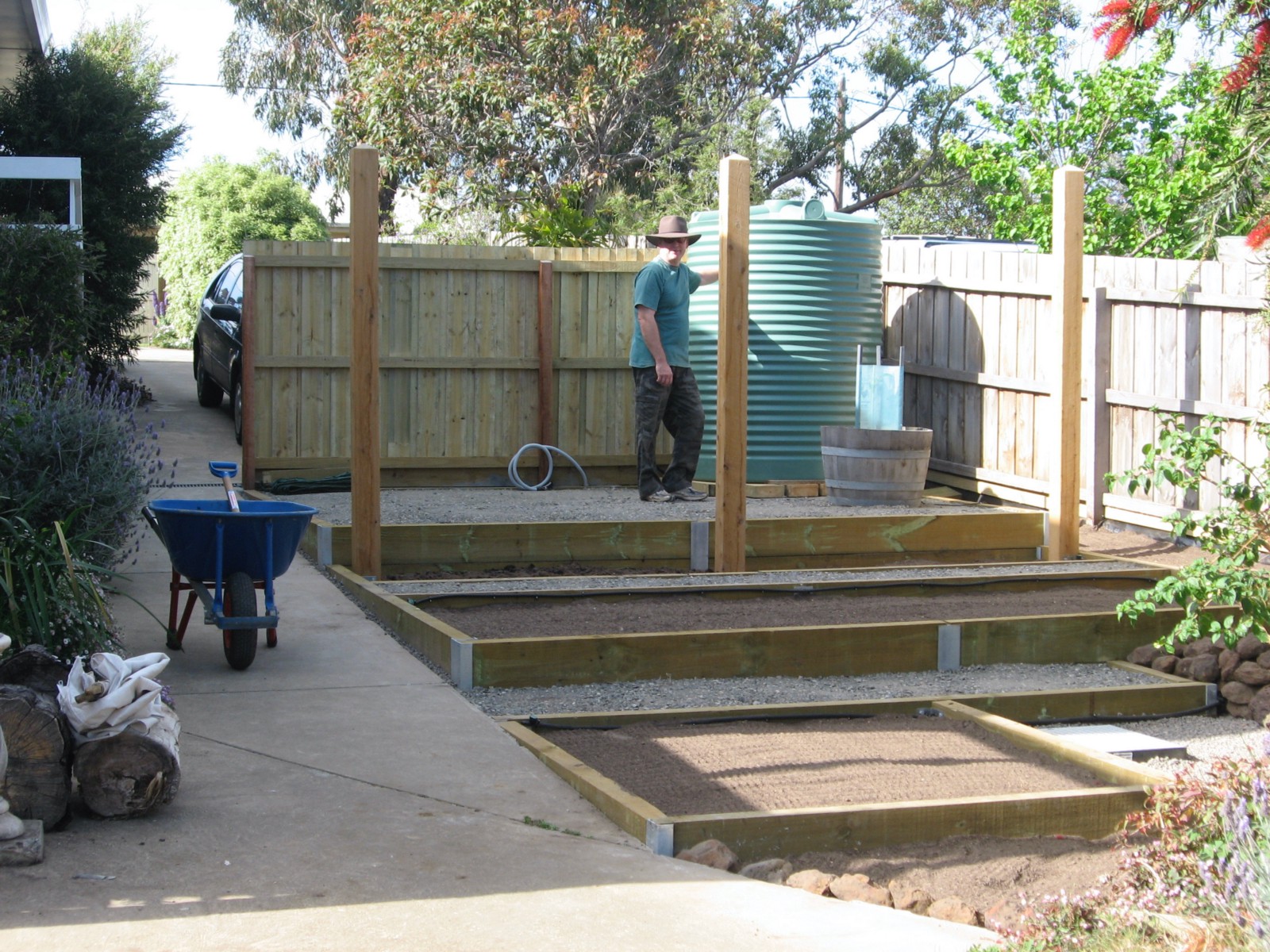 We built a timber shed, with a shady veranda made from our old garage door. We installed a 2,000-litre rainwater tank, constructed a four-bay compost system (such opulence!) and set about digging out the tenacious kikuyu grass and blanket weed which covered the area.