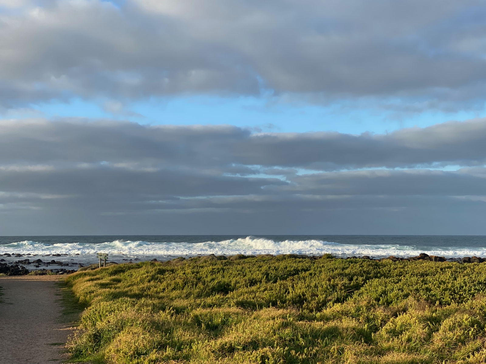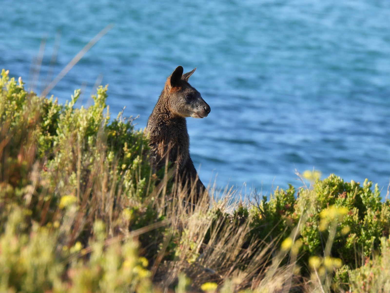 I cross the causeway to the low-lying island, covered by heath dotted with thorn bushes. The breeze off the Southern Ocean grows stronger and cooler on my face. A couple of hundred metres along the track (stopping to say G’day to a browsing wallaby) and I can see the white surf ahead, pounding the black basalt reef.