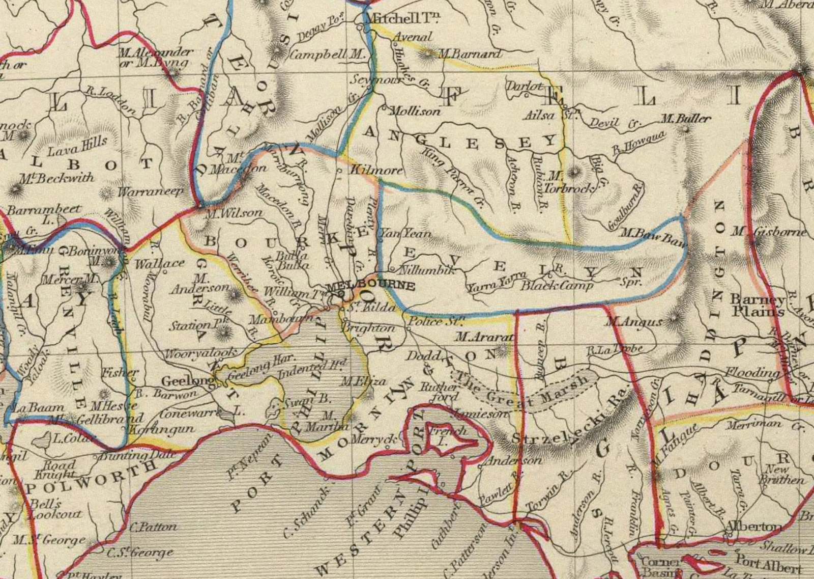 I find myself drawn to write a novel set in the 1860s in the Acheron Valley, in Murrindindi Shire, nestled into the Great Dividing Range. It’s in the district marked with the defunct name ‘Anglesey’ and outlined in yellow on the map above. In my lightly fictionalised landscape, the five main rivers that flow into the Goulburn have the names of the five rivers of Hades, and are encompassed in a great pastoral station, the Five Rivers Run.